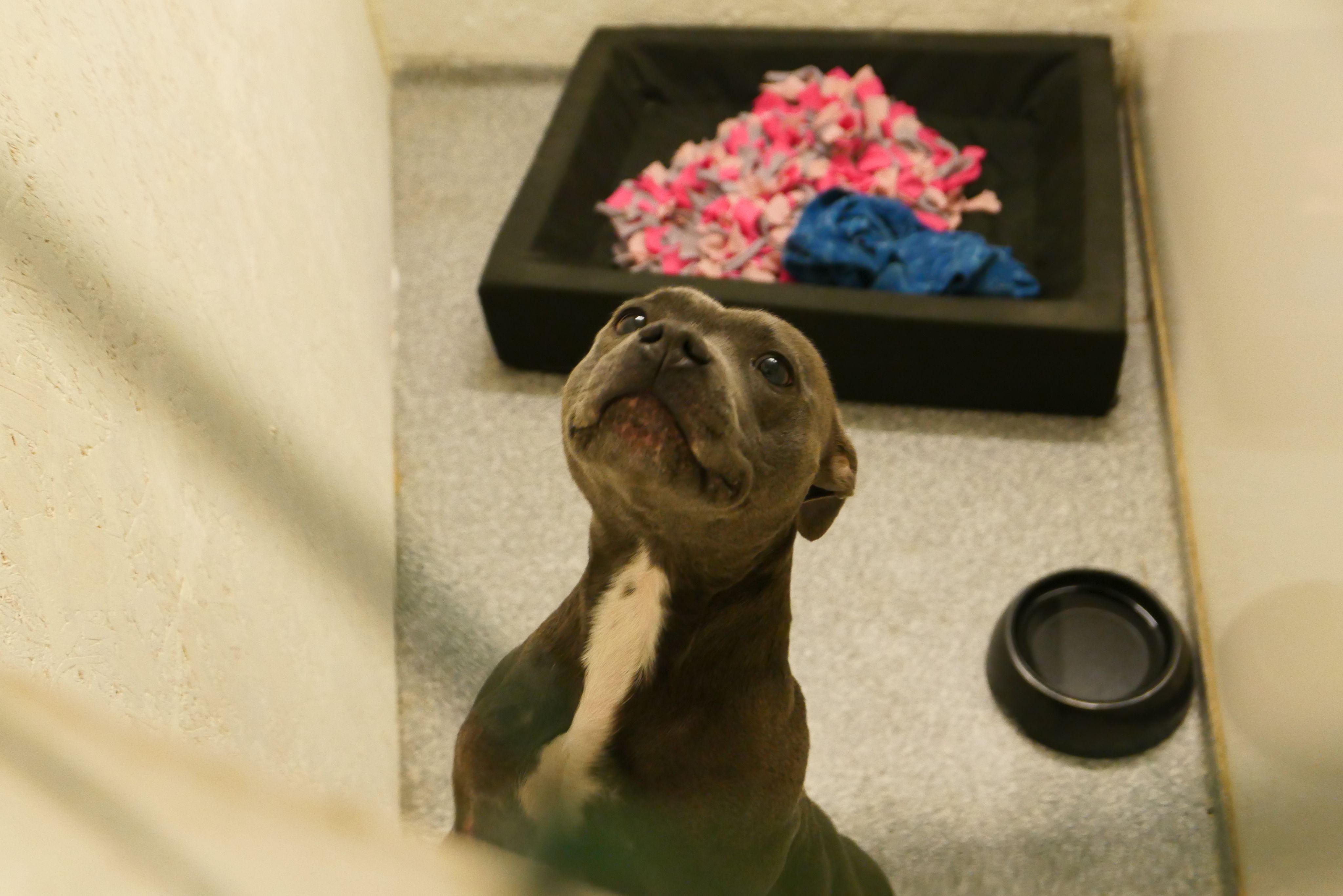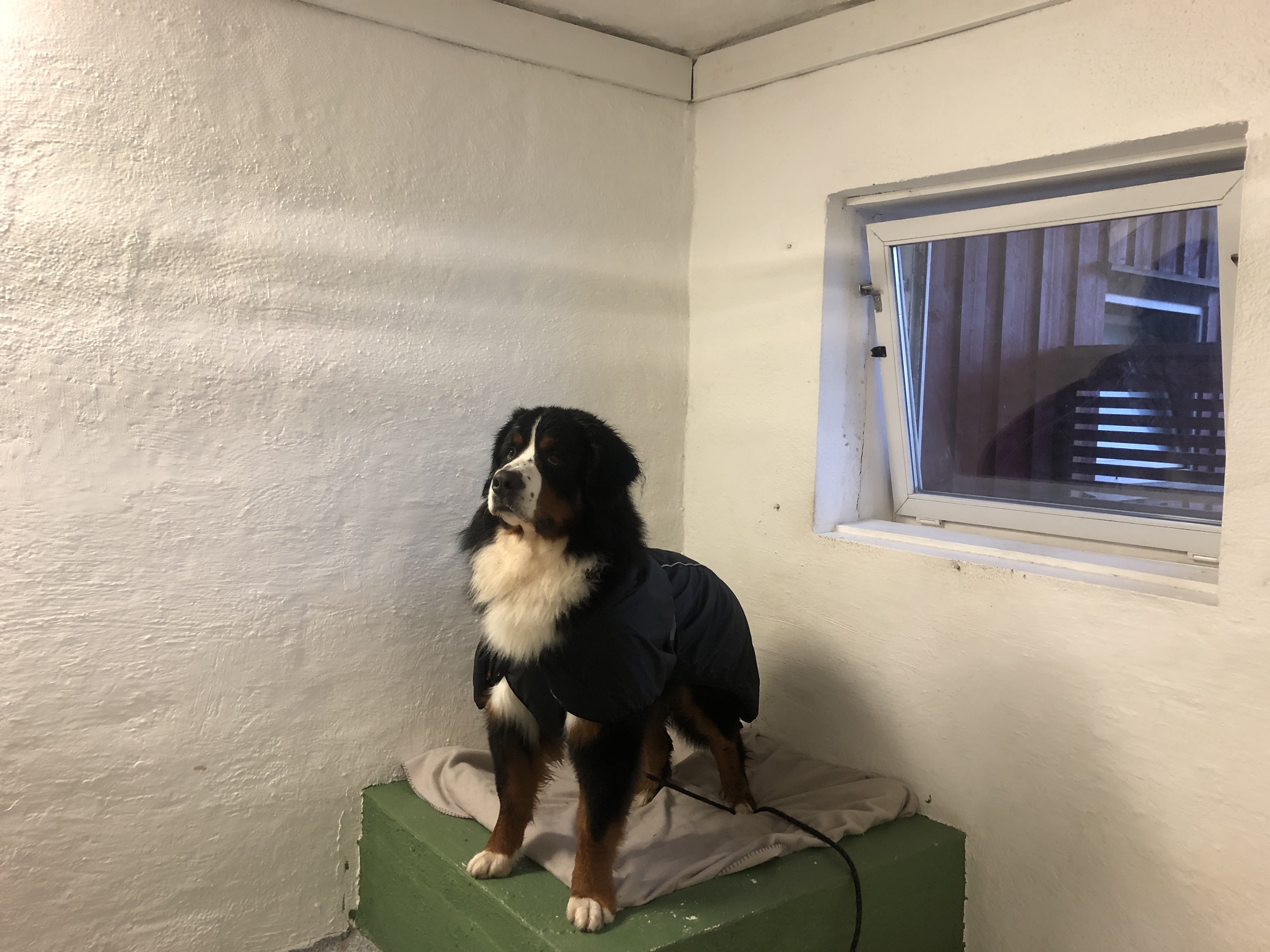 Vi blir ledet til en del av gården som tidligere ble brukt som stallplass. Lyden av bjeffing og klynking fyller rommet. De gamle ponniboksene på gården rommer nå andre firebeinte venner.