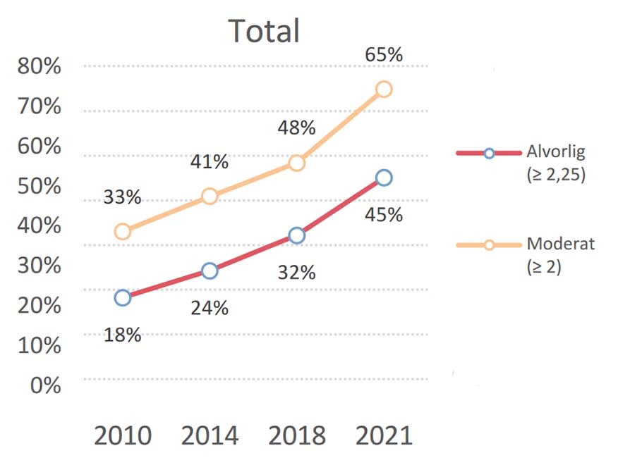En ny undersøkelse, utført av Studentenes helse- og trivselsundersøkelse (SHoT) viser at hele 45% av studentene har opplevd det som karakteriseres som høyt nivå av psykiske plager under pandemien. Det er en økning på 12 prosent fra 2018 da 32 prosent av studentene hadde et høyt nivå av psykiske plager.