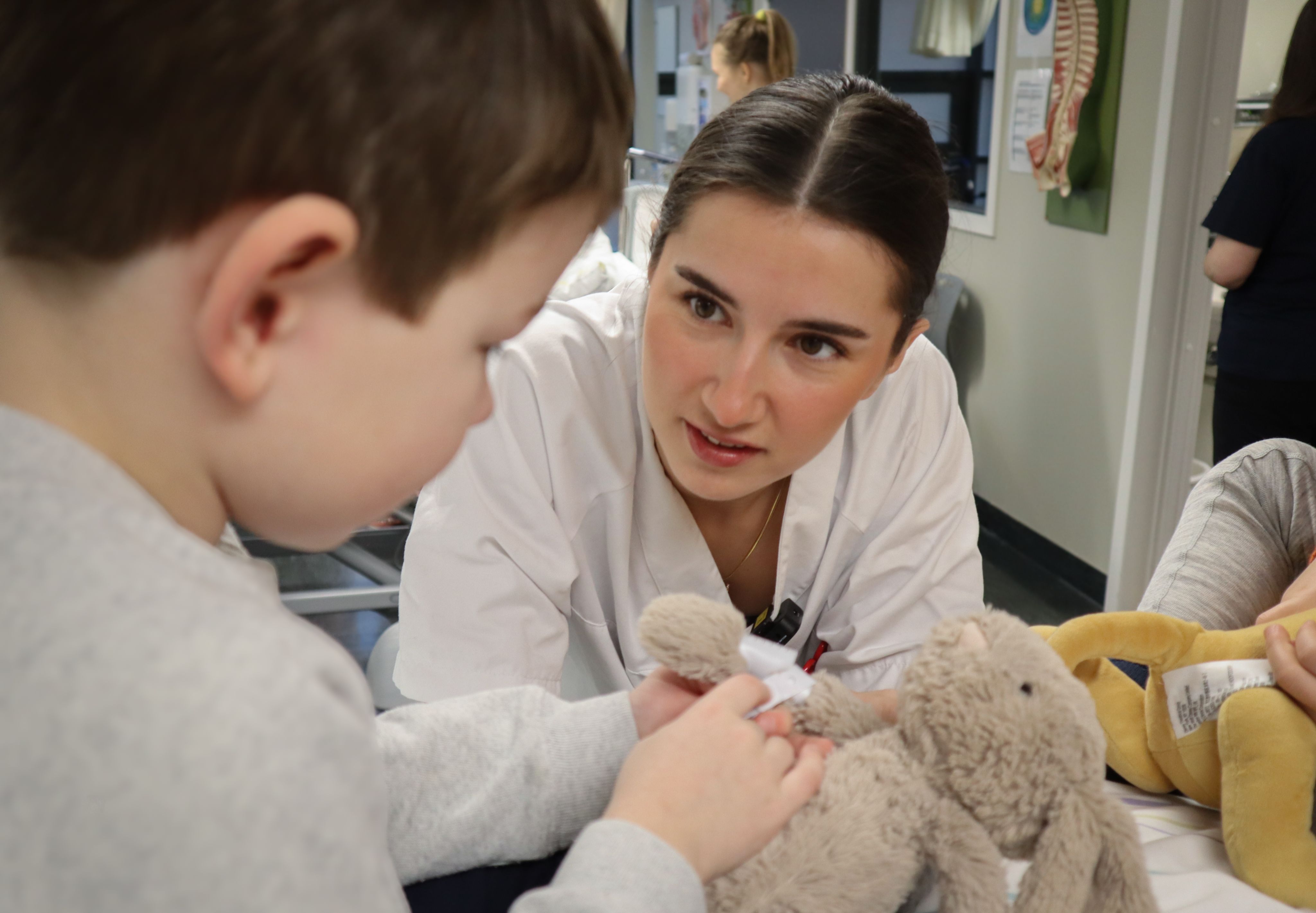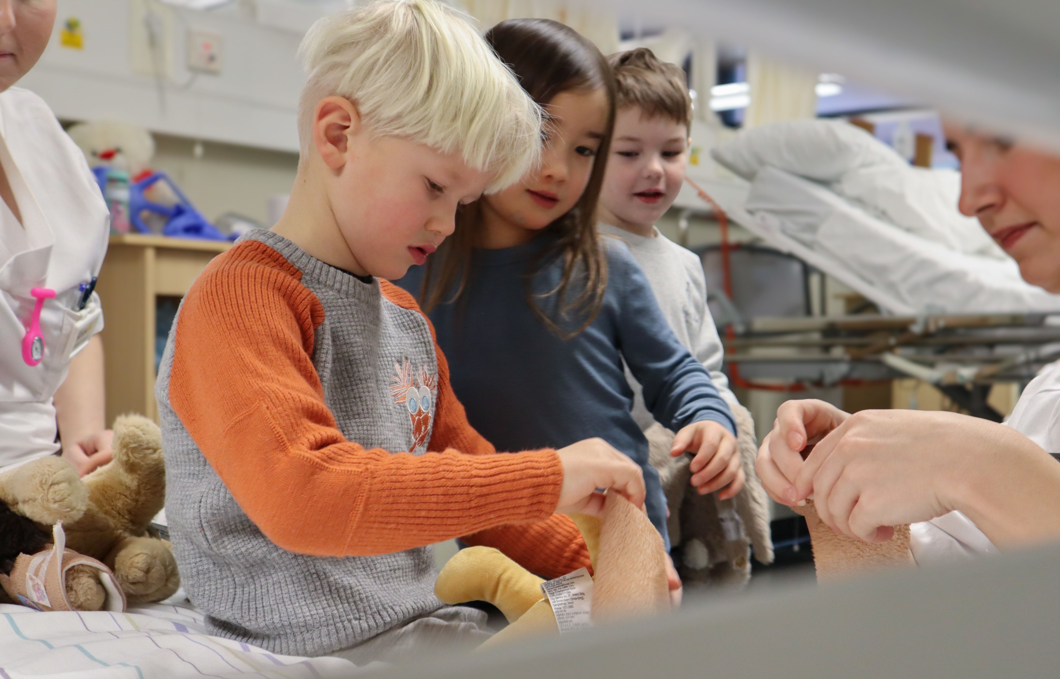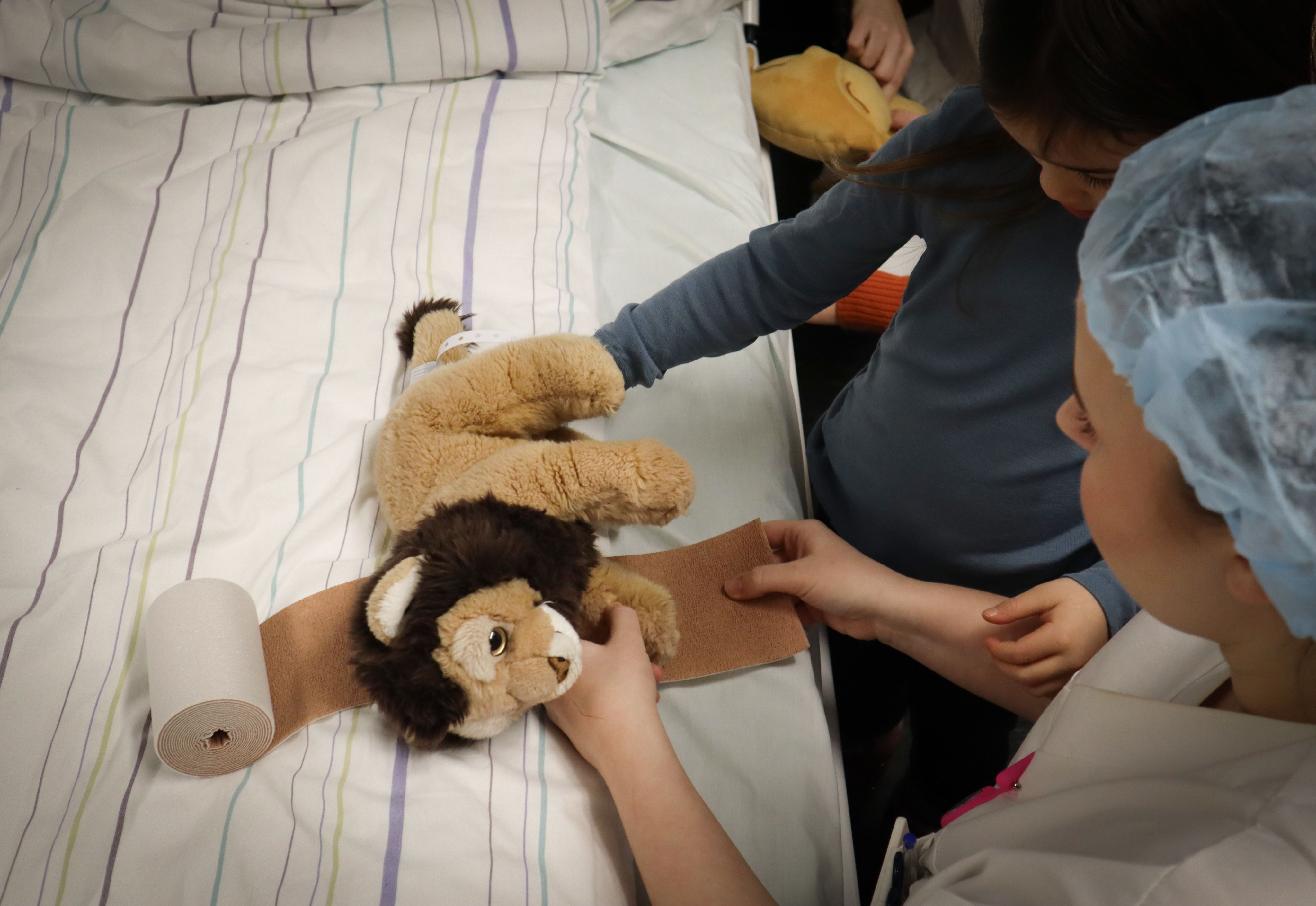 Tilbake i sykehussengen, får barna ta på både bandasje og plaster på bamsene.