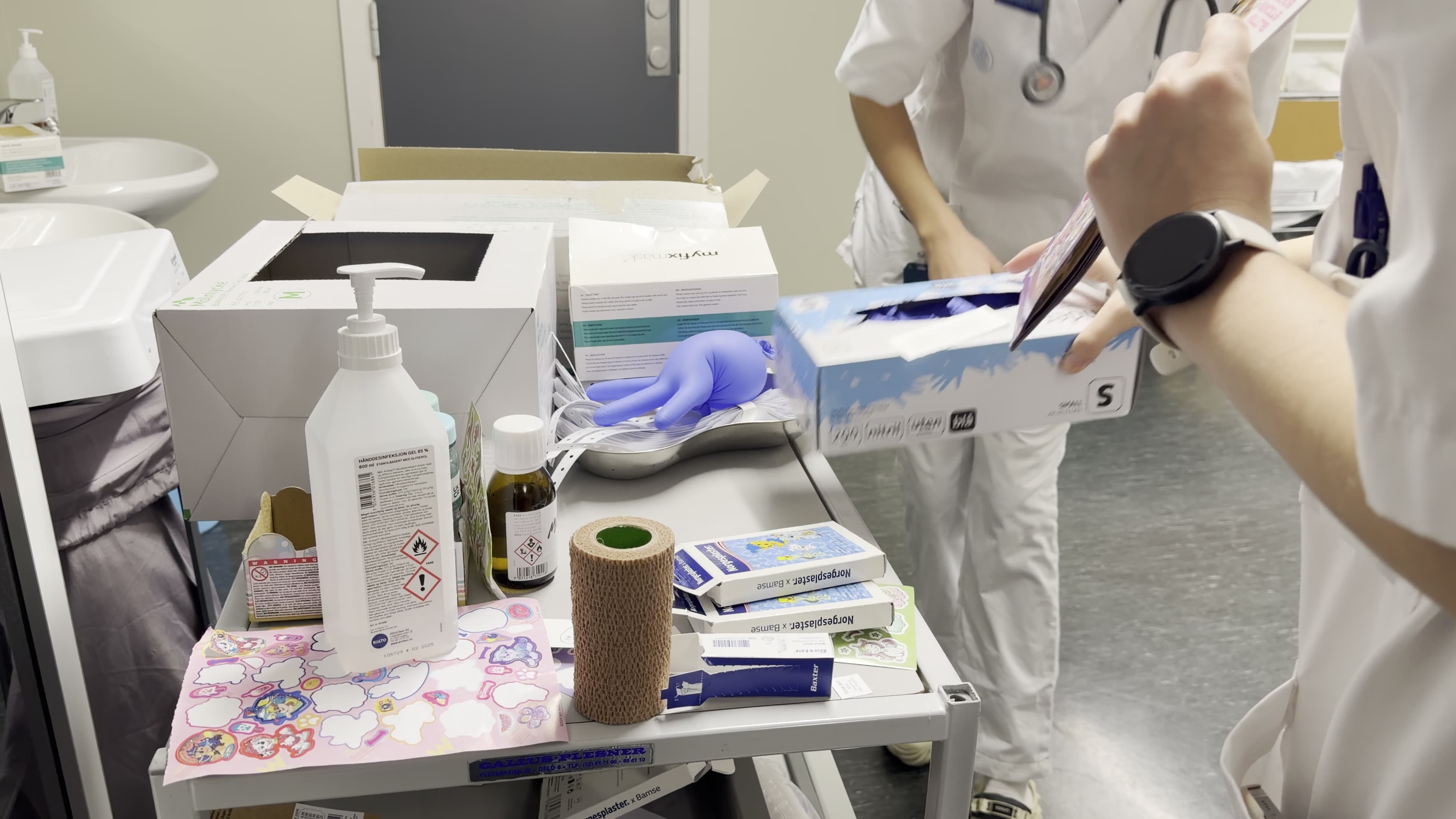 Fargerike plaster, oppblåste hansker og klistremerker legges frem før pasientene kommer.