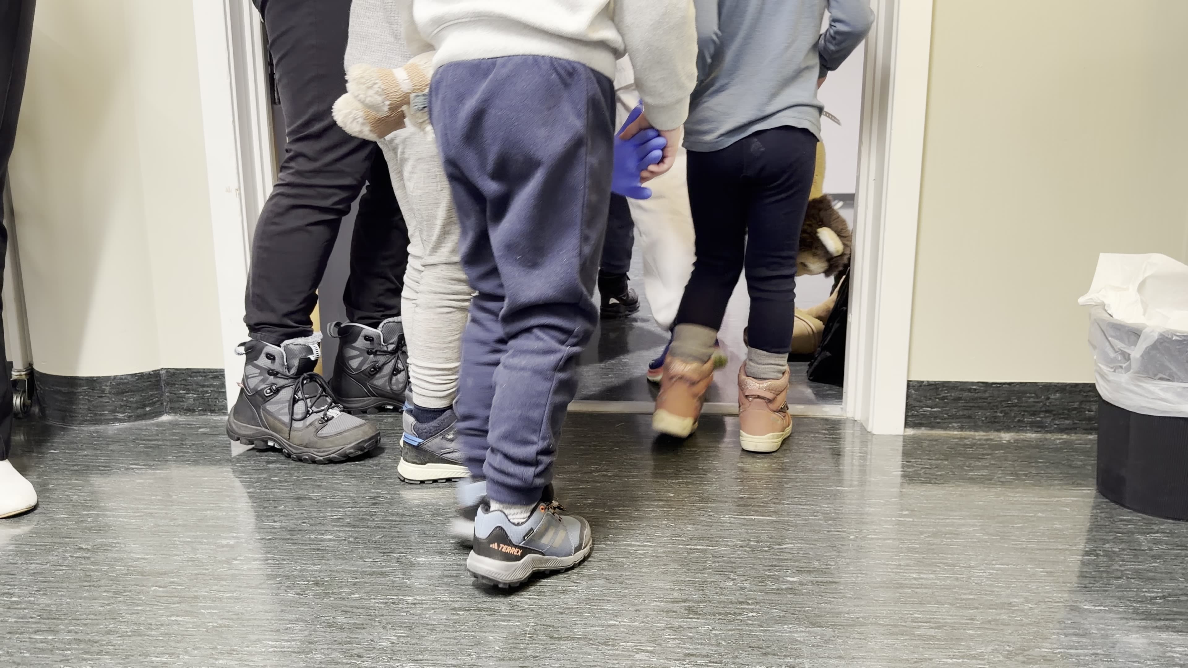 Små sko trasker inn gjennom døra, med bamser på slep.