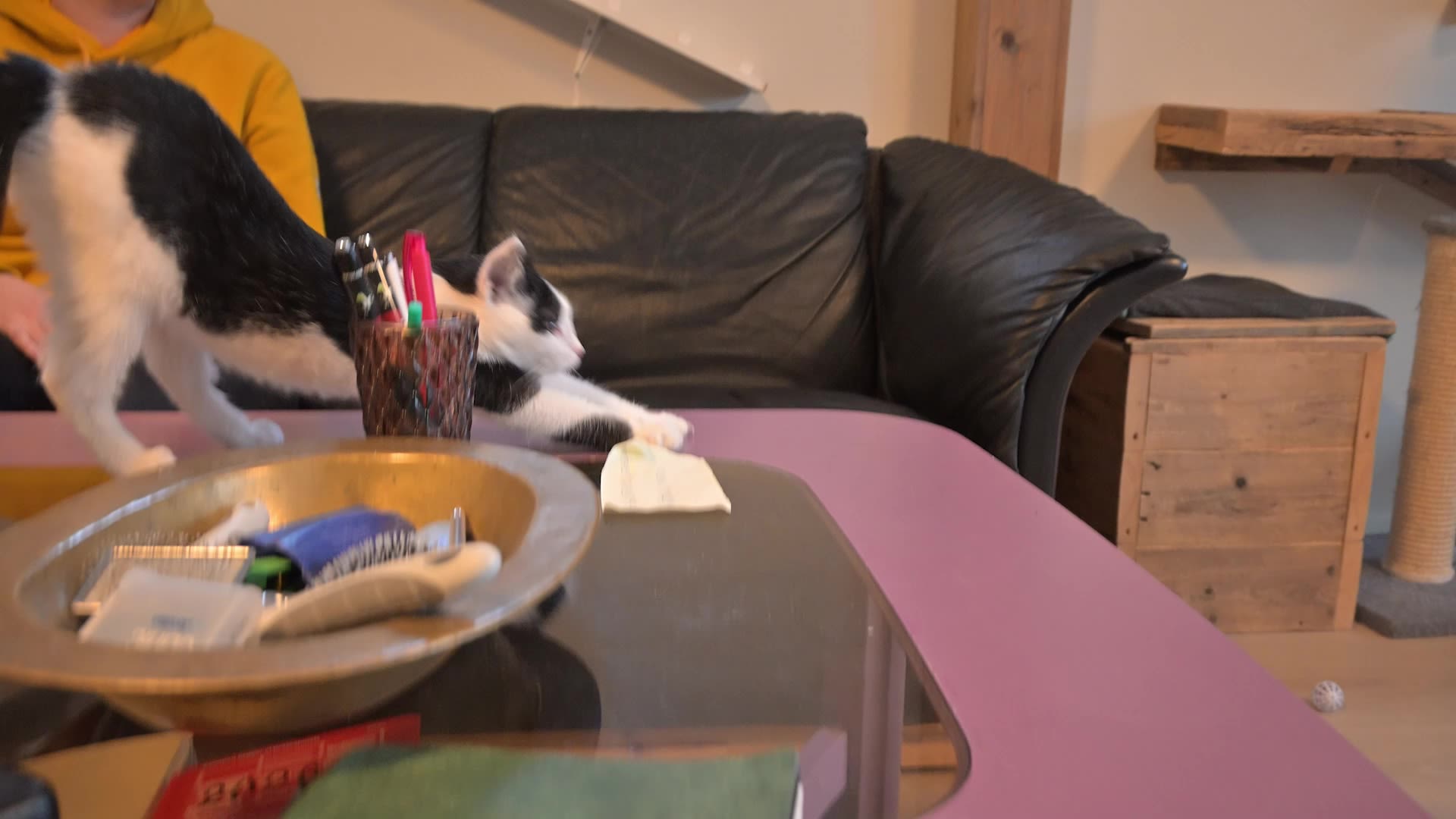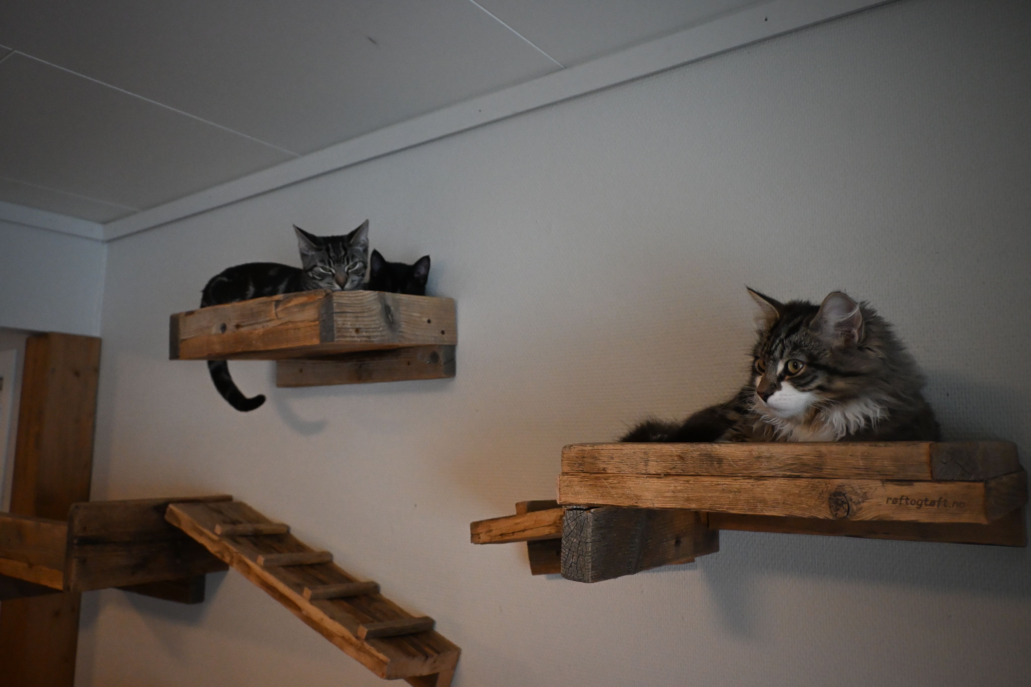 Det klatres på veggene og helt opptil taket. De lettbeinte kattene har lagt seg for å slappe av, og har nå full kontroll over det som skjer under seg.