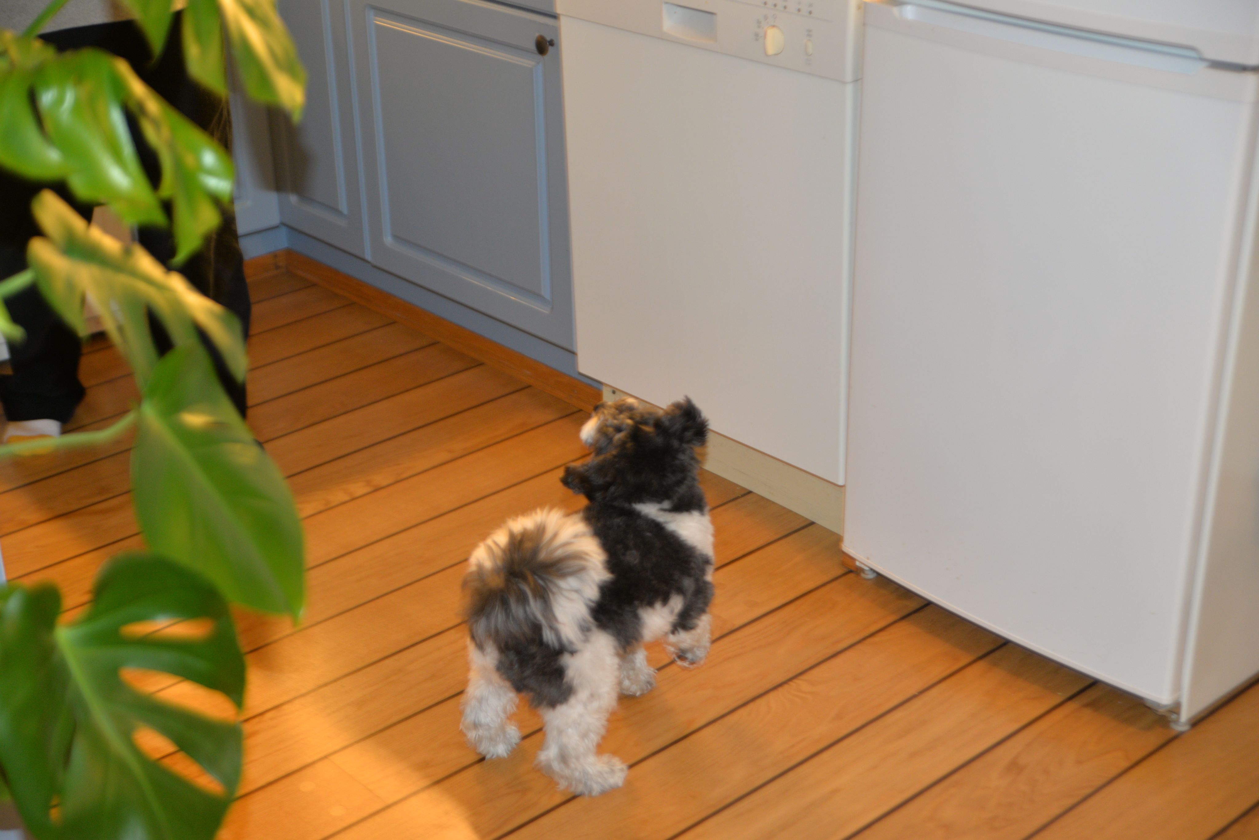 Den firbente vennen tusler forsiktig bort. Plutselig kommer det et drønn fra kaffemaskinen.