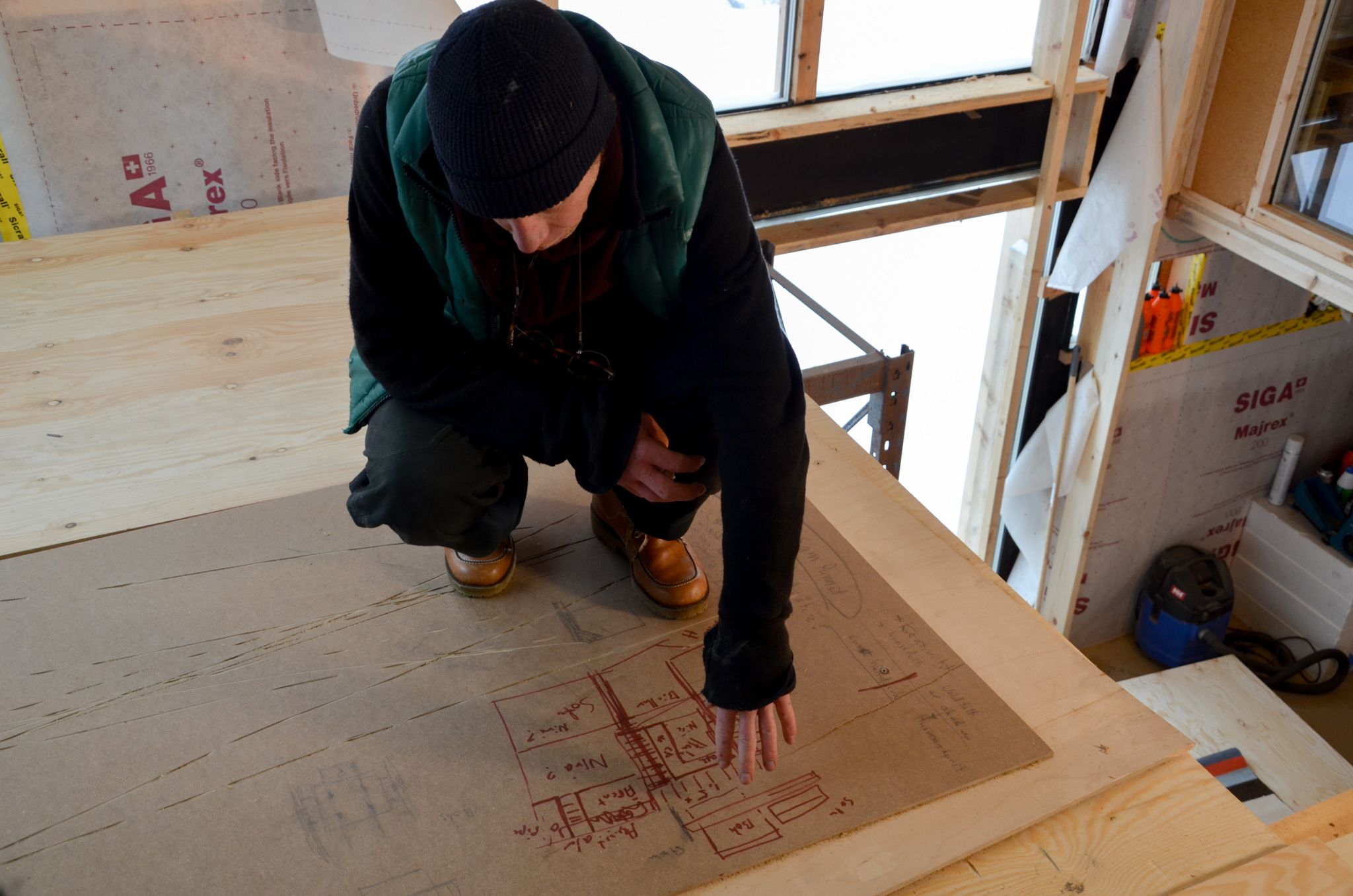 Når kunden er han selv, er prosessen litt mer komplisert. Ting er hele tiden i endring og dette er hans siste idè for andre etasje. Monan forteller at det går like mye tid til tenking som bygging, når man er sin egen arkitekt, snekker og kunde. Foto: Karianne Storesund