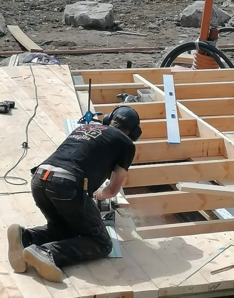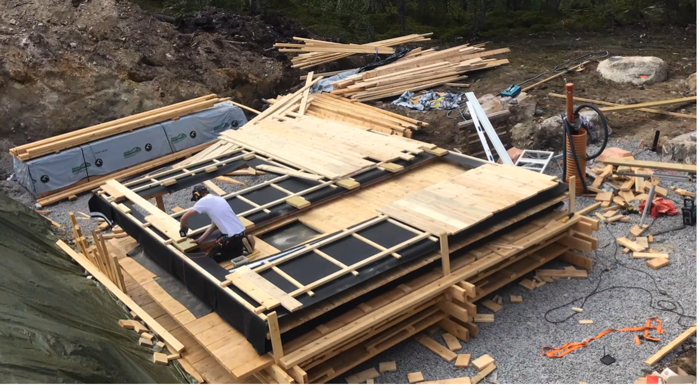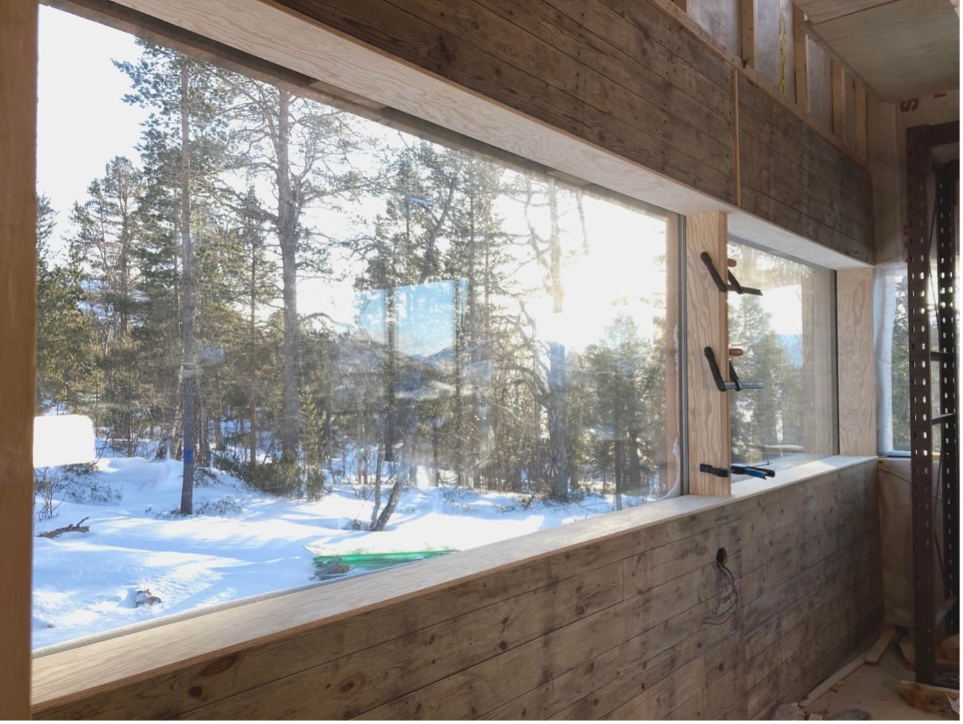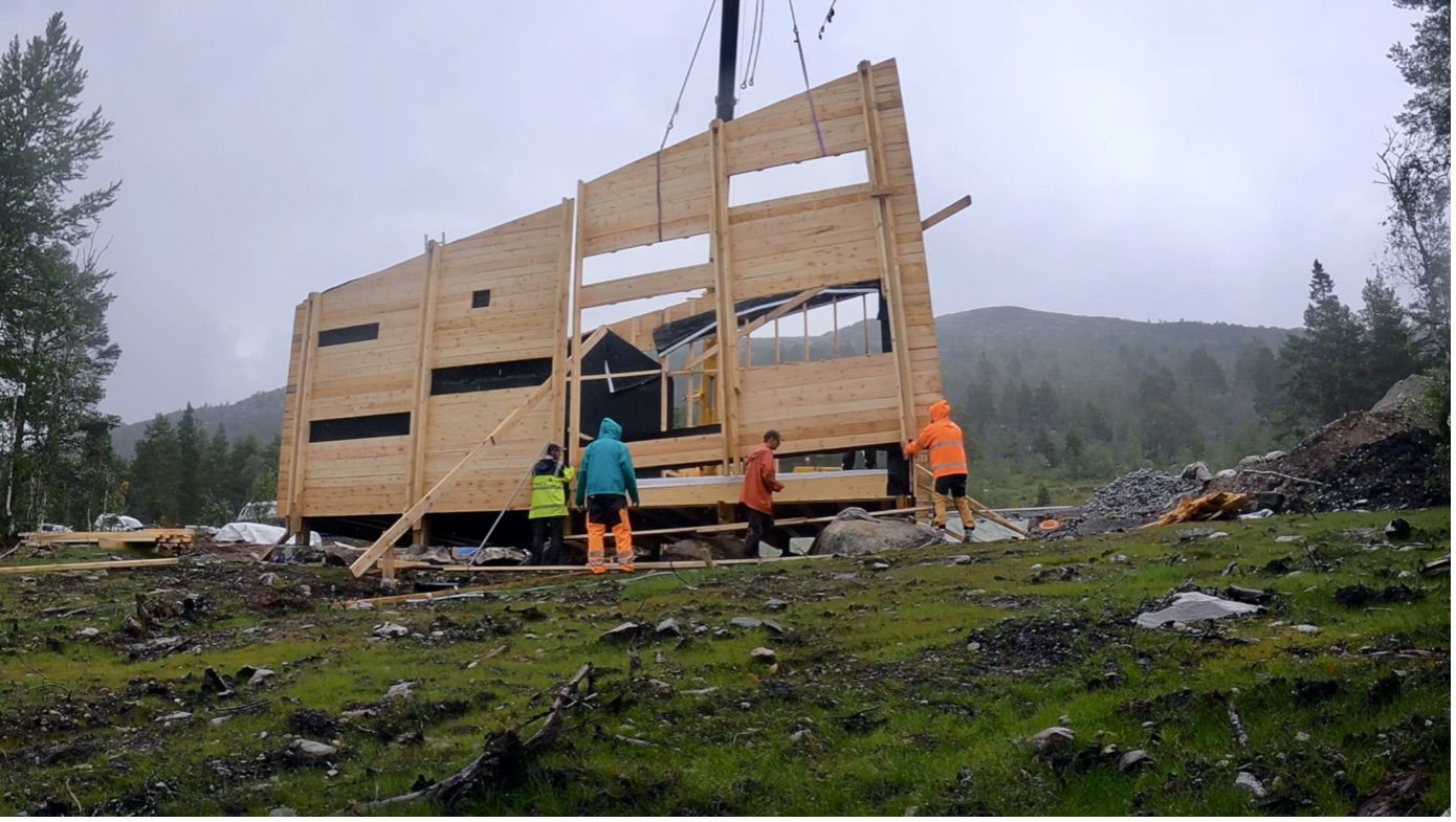 Tilbake til huset vi nå sitter i. Monan forteller at prosjektet begynte for alvor i mai 2021. Da ble tomten gravd ut, materialene fraktet opp og Monan stod hele sommeren og bygde ferdig veggene som elementer. Vegger og tak ble løftet på plass ved hjelp av mobilkran, og i løpet av noen hektiske dager i midten av august var vegger og tak på plass.