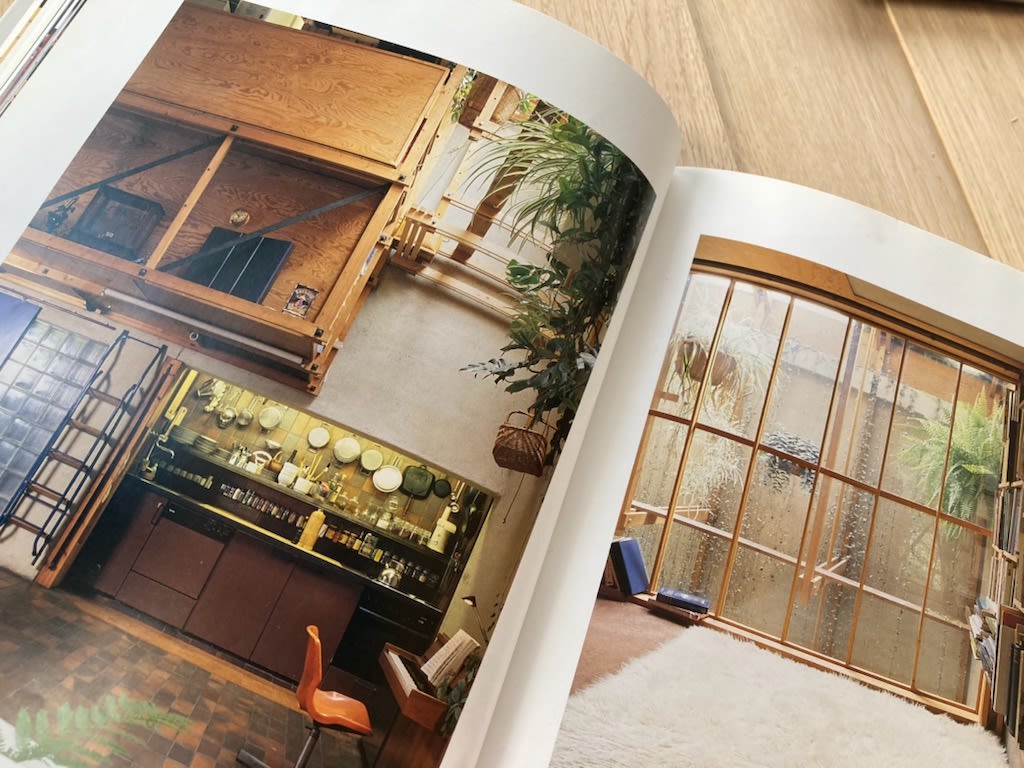 - Denne boken kjøpte jeg kun på grunn av dette bildet. Jeg ble helt oppslukt i disse detaljene, og måten arkitekten har lekt seg med rom og nivåer. Monan peker på et stort vindu høyt oppe på veggen i stua.