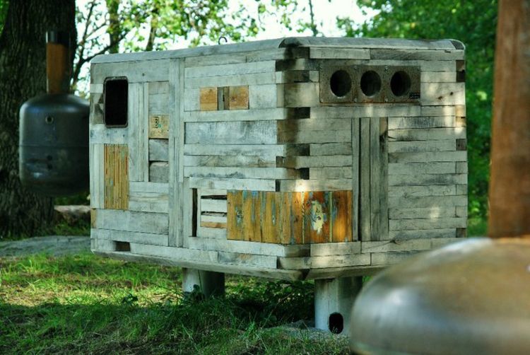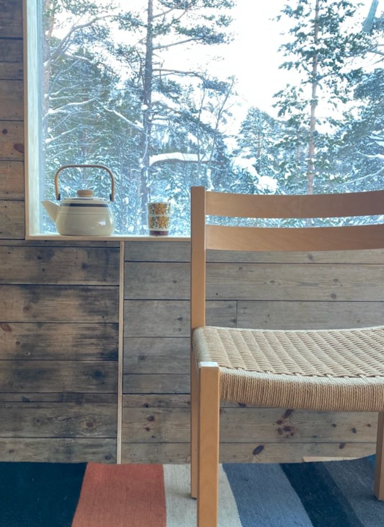 Den ene veggen i oppholdsrommet skiller seg ut fra de andre. Den ser mer slitt ut enn de andre veggene med helt nytt treverk. Monan forteller at den veggen pleide å være et tregulv som ble lagt inn i partytelt.