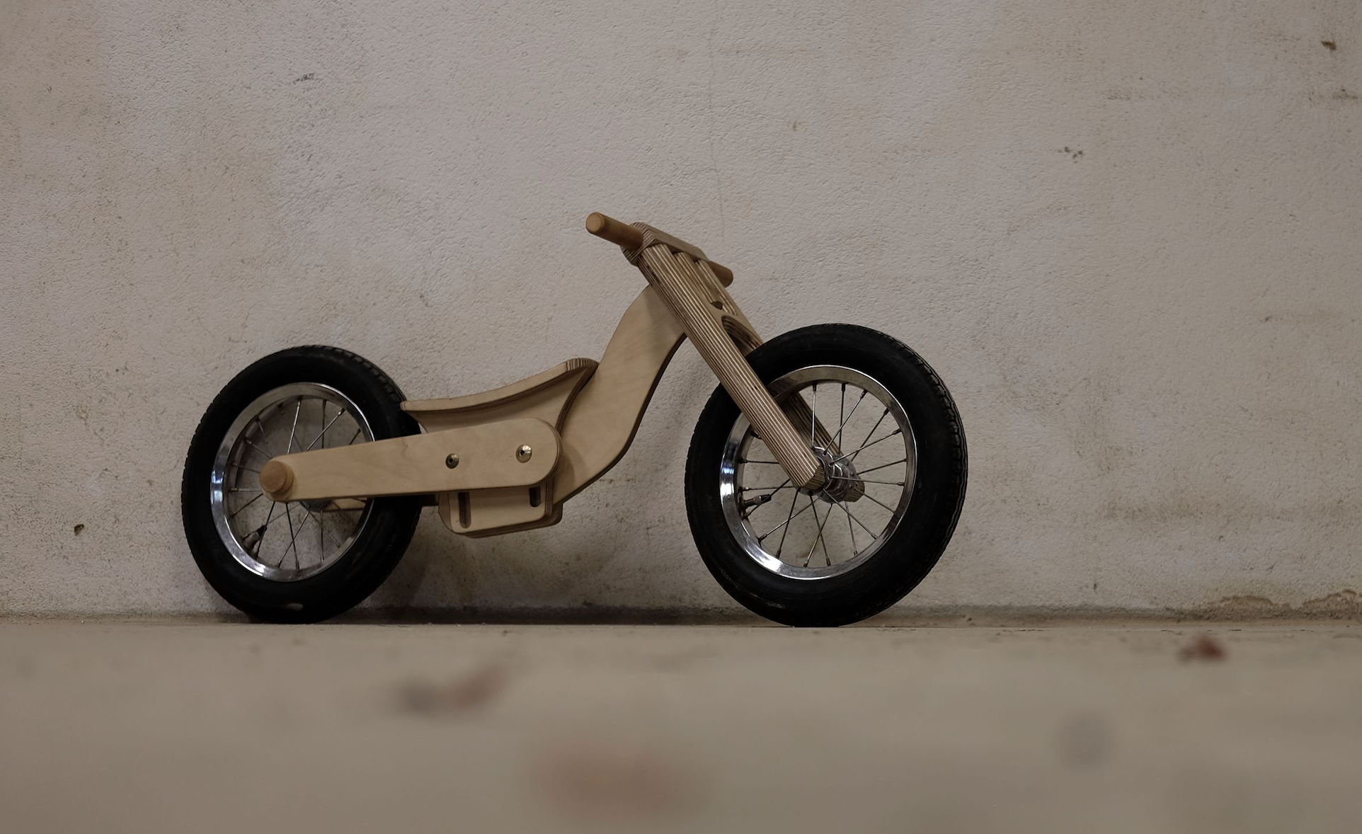 Sykkel laget av gjenbruksmaterialer, blant annet er hjulene fra en ødelagt barnevogn. Foto privat
