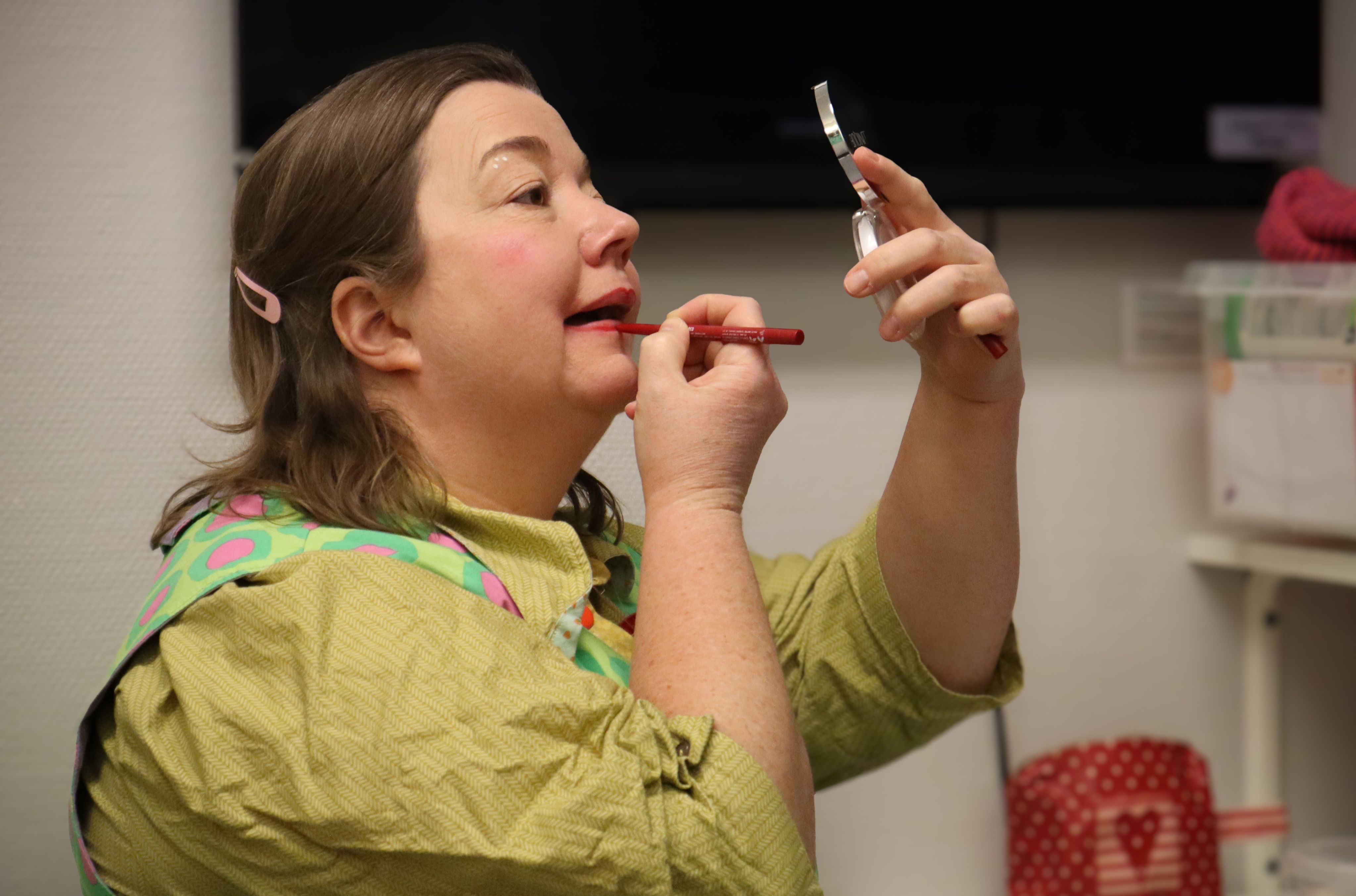 Ved siden av sitter Marianne Jonger (52) og farger leppene røde