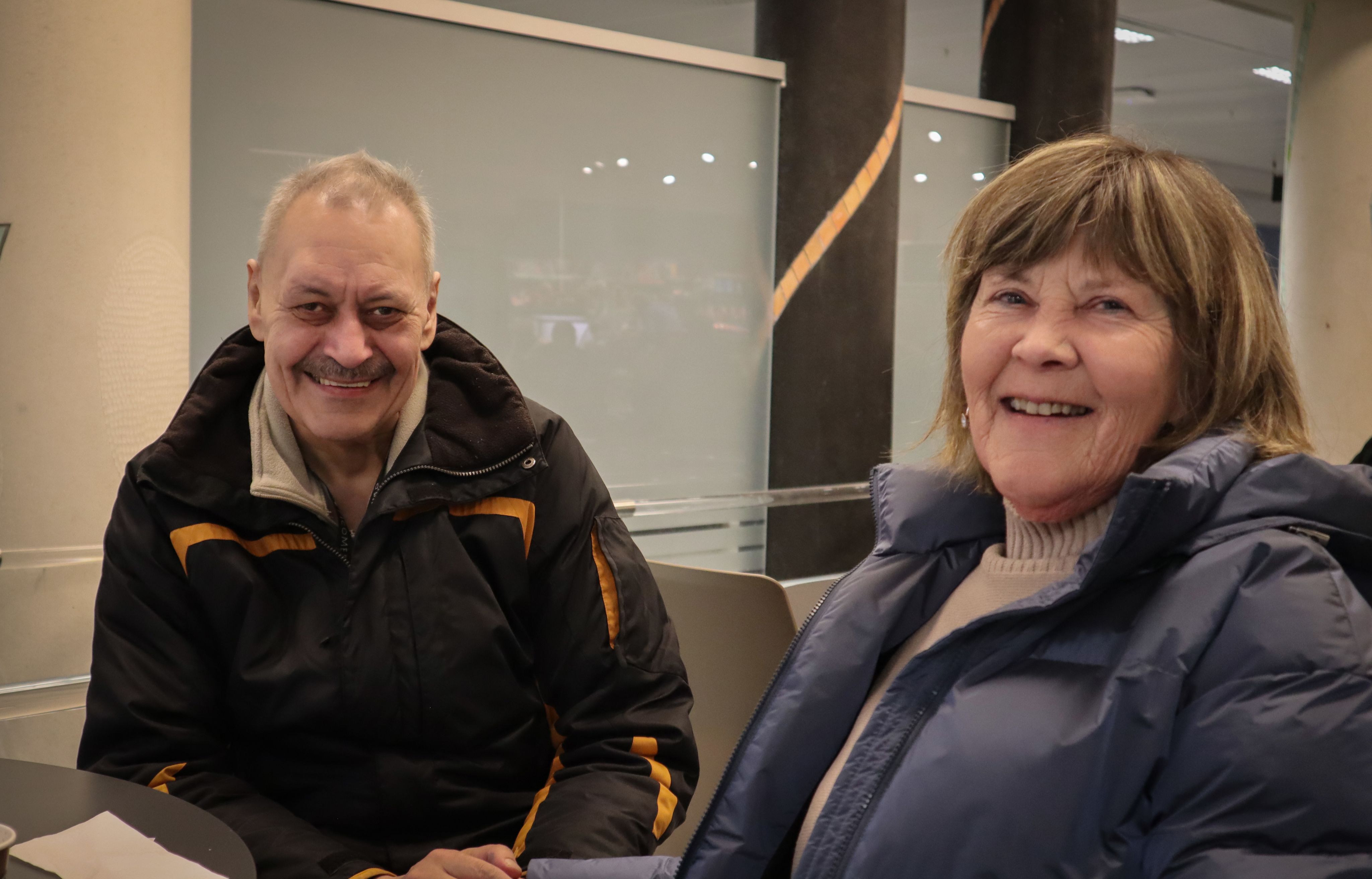 Sykehuslovnene kom som en overraskelse for Roger Ovensen (59) og Kari Kolbu (71), som sitter i kantina på sykehuset. De hadde aldri sett sykehusklovnene før nå, og de fikk et smil om munnen da de kom for å muntre opp ungene og de andre i gangene.