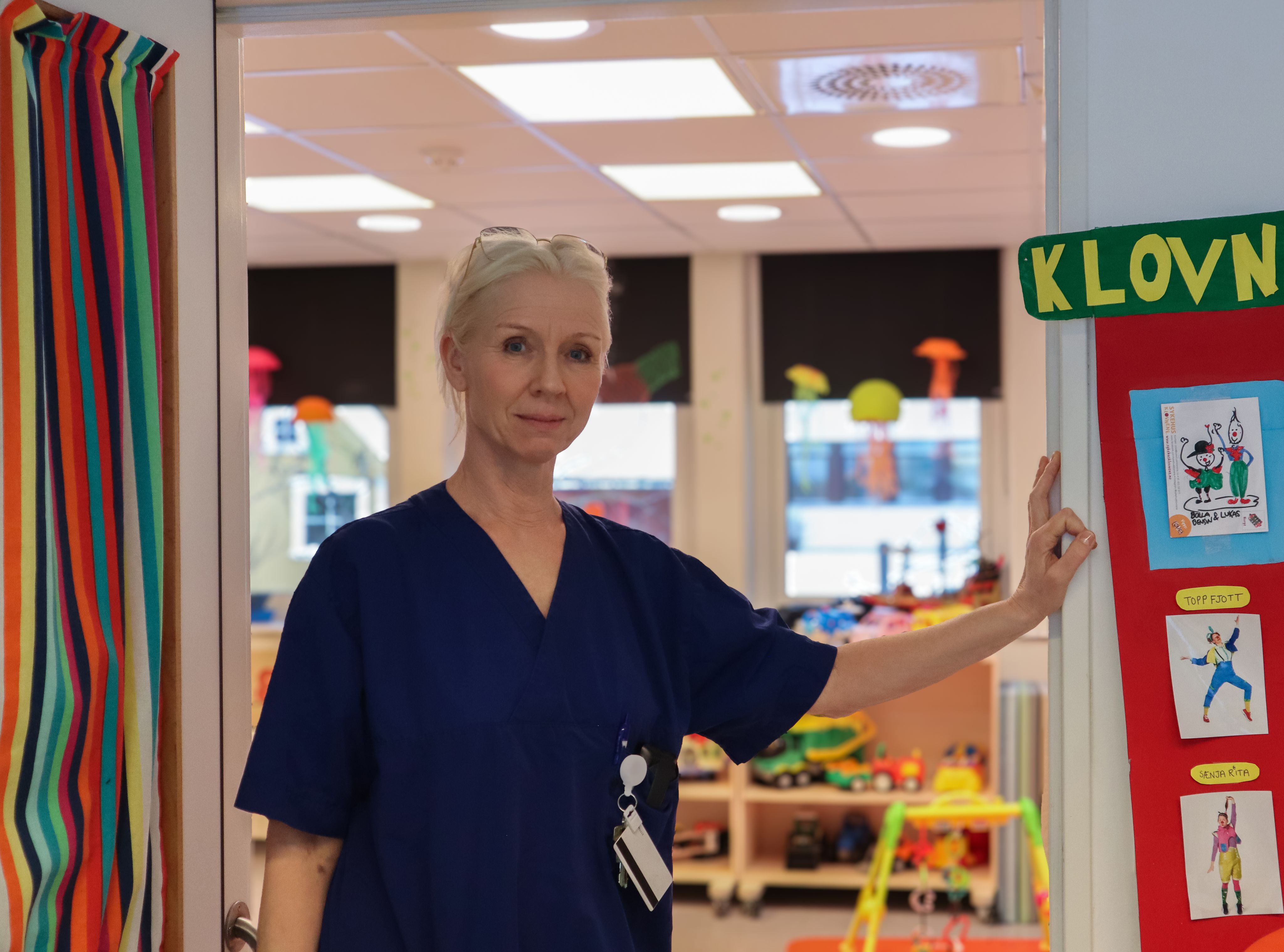 Birgitte Ording (57) er barnehagelærer og er ansatt ved barne- og ungdomsavdelingen på sykehuset. Hun forteller hvordan tiltak som lekerom og sykehusklovnene, hjelper barn som pasienter på sykehuset.