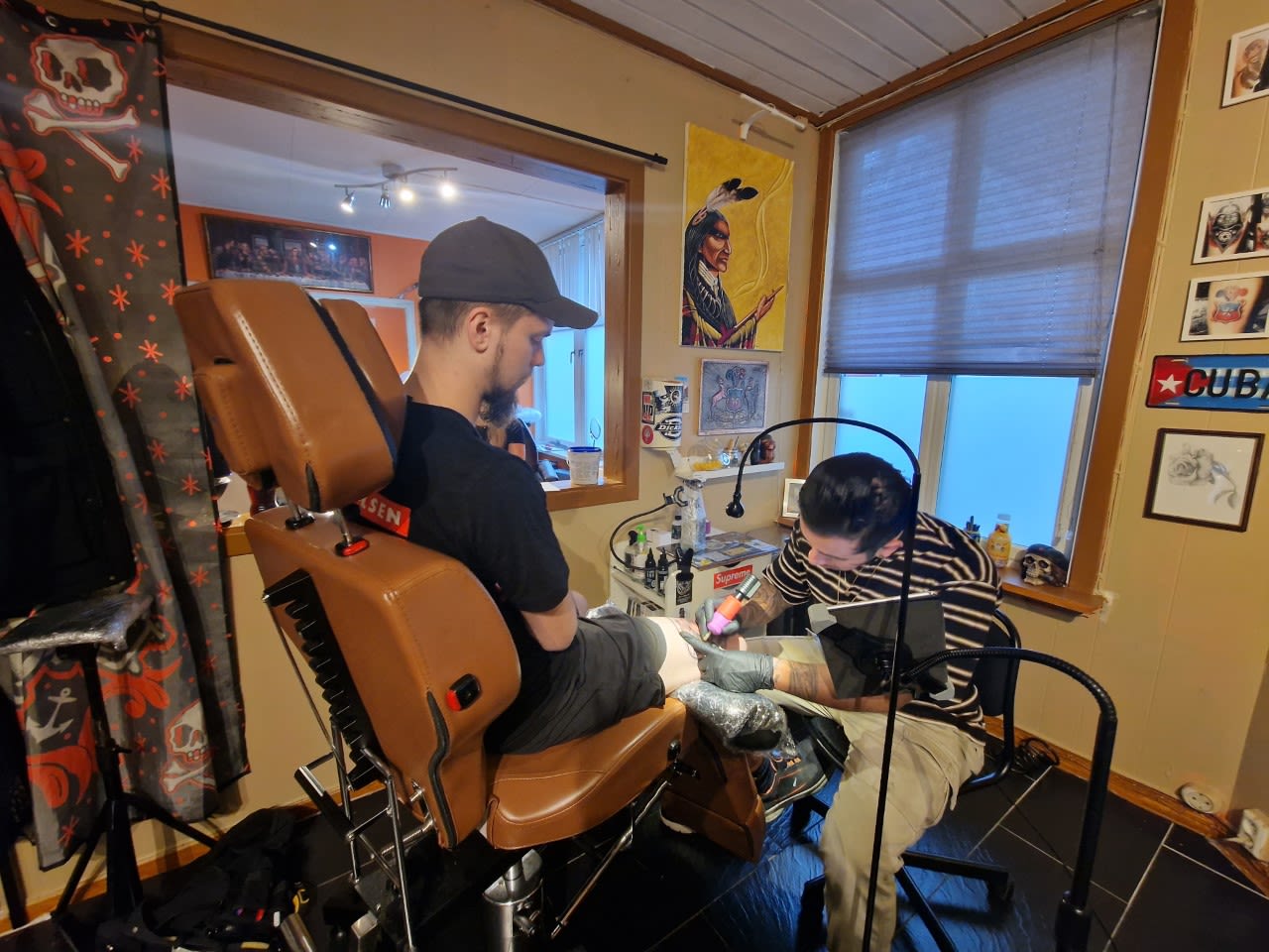 En svak summing kom fra bak i lokalet hvor tatovør stolene står plassert side om side kan høres i det fjerne.
