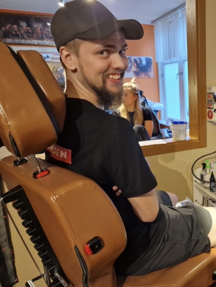 Mikael sitter å smiler i tatoverings stolen, og planlegger allerede å ta flere i nærmeste fremtid.