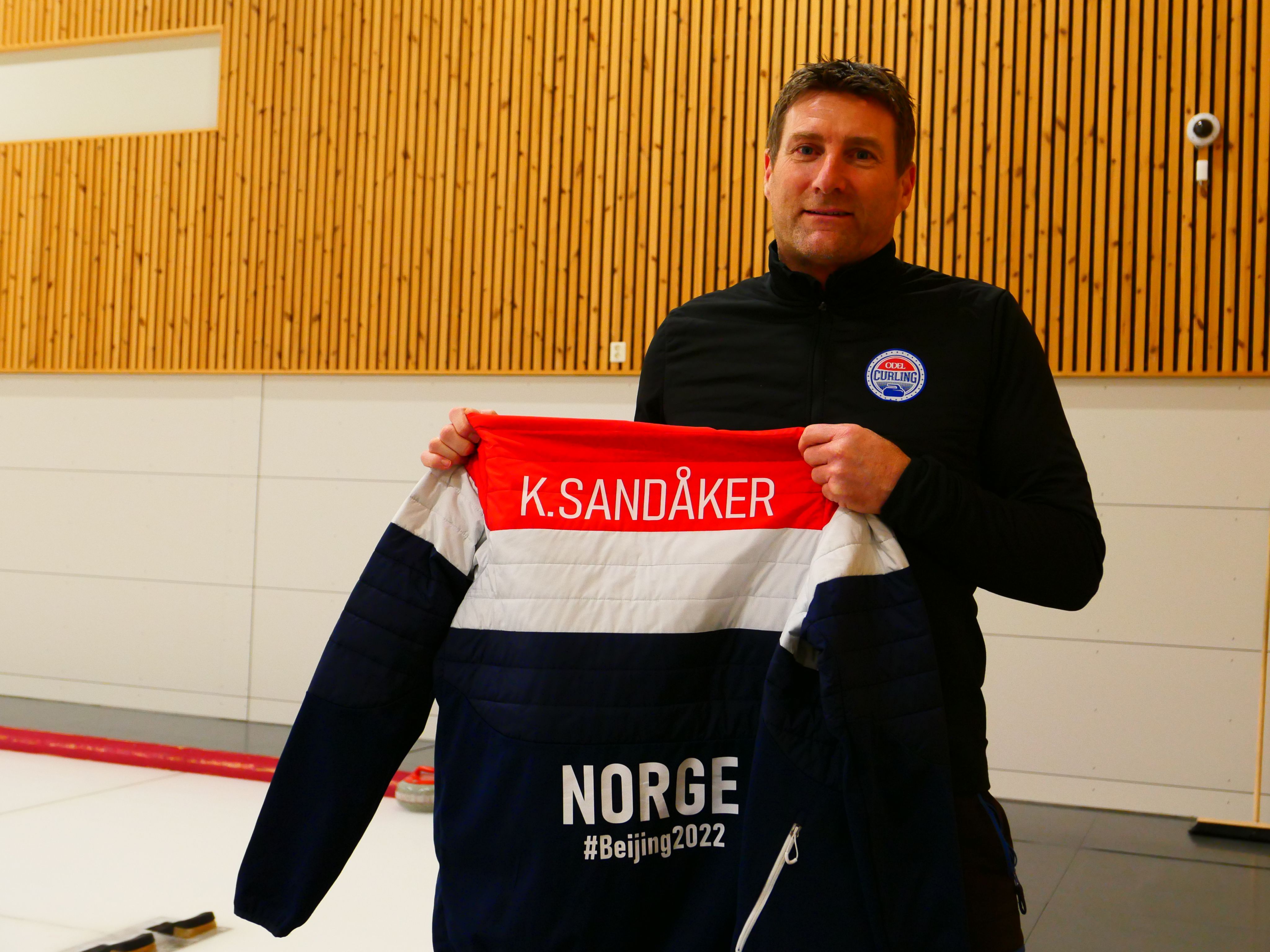 HUMORISTISK: Karsten Sandåker kunne med en morsom tone vise frem den egendesignede jakken. Han forteller at selv om Odel curlingklubb ikke er på et olympisk nivå, så kan man drømme seg bort. Foto: Bertha Natalie N. Hognestad