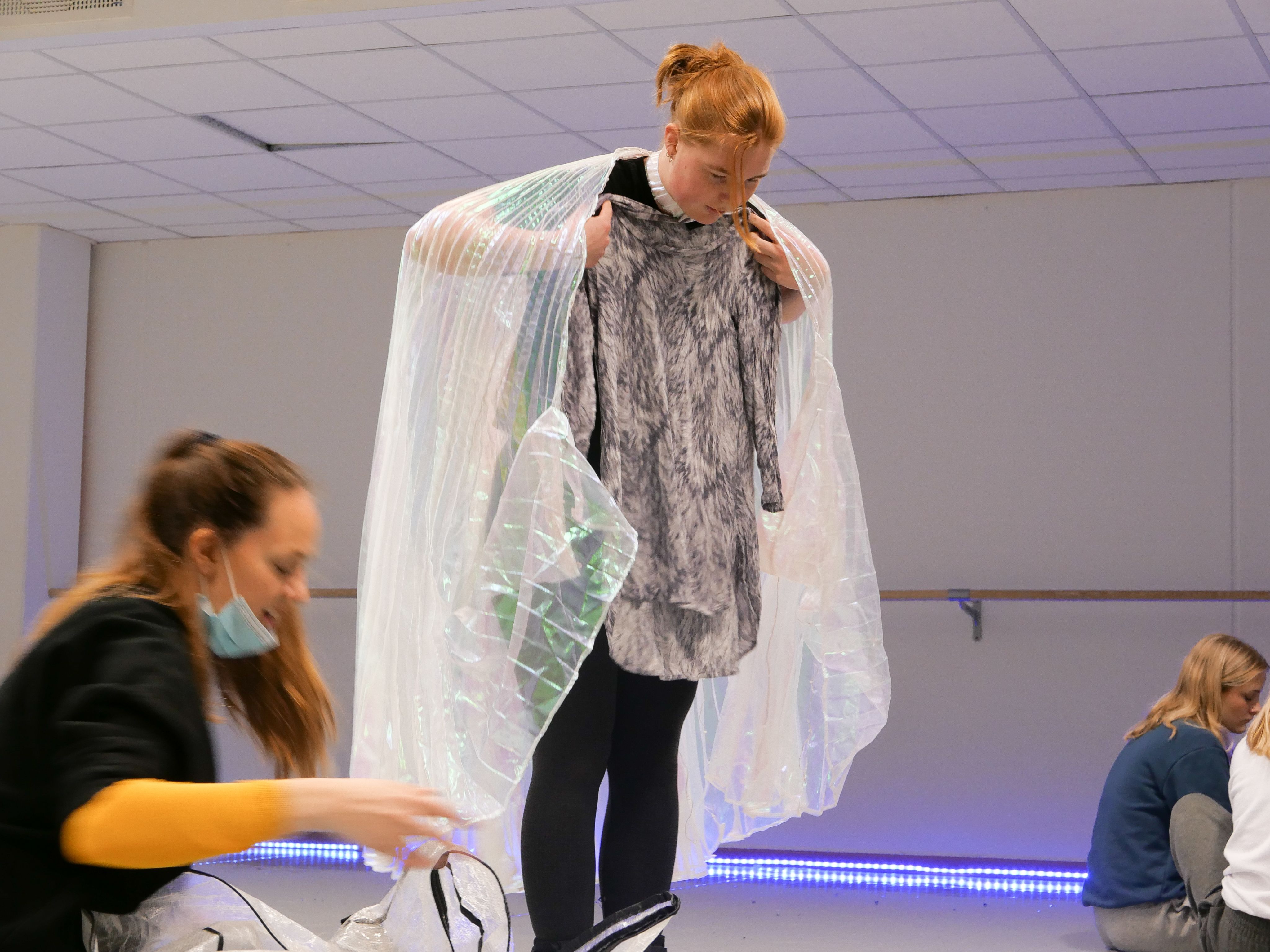 Christina Louise Markhus diskuterer kostymene med elevene.